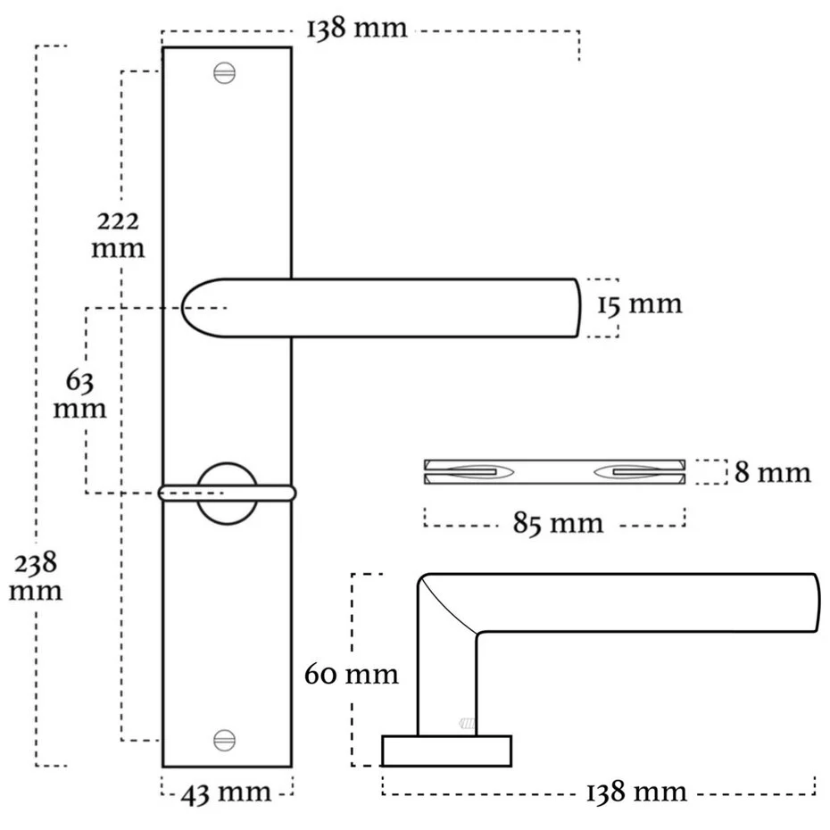 De deurklink met schild heeft een PC-maat van 63 mm. De PC-maat geeft de afstand aan tussen het hart van de deurklink en het hart van het slot, zodat je zeker weet dat deze perfect past op jouw deur.