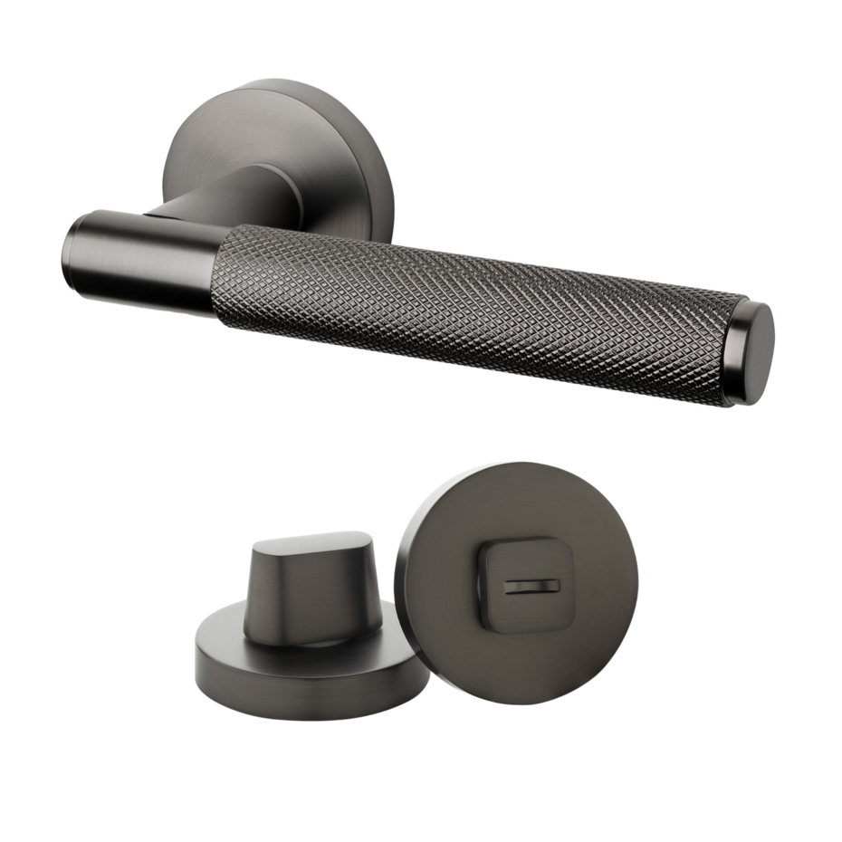 De geveerde Luxor deurklink in trendy antracietgrijs combineert een strak, modern design met optimaal gebruiksgemak. Het opvallende ronde ontwerp is voorzien van een elegant ruitmotief, dat je deuren direct een luxe uitstraling geeft. De deurklink wordt geleverd met een bijpassende toilet-/badkamersluiting, zodat je interieur compleet en stijlvol afgewerkt is.