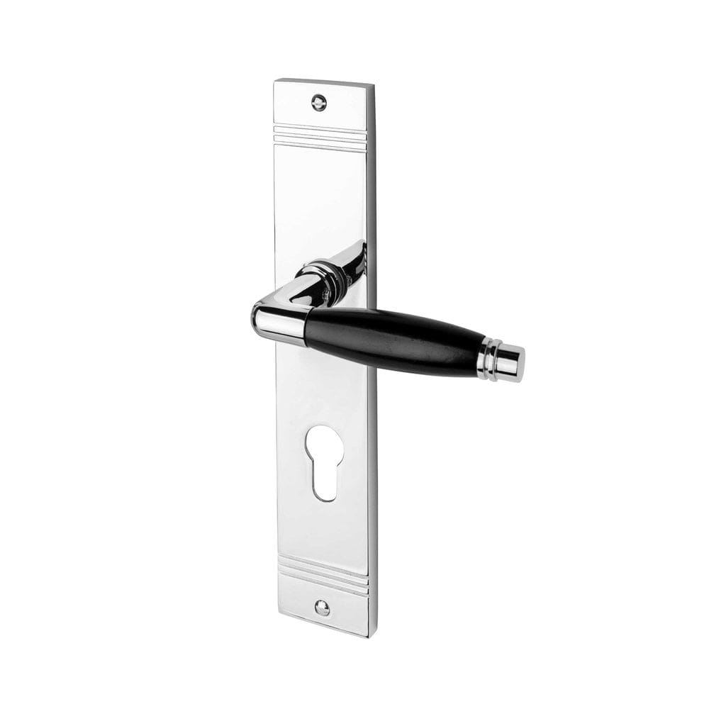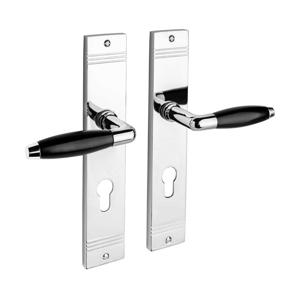 Klassiek geveerde deurklink op schild cilindergat 72mm glanzend nikkel