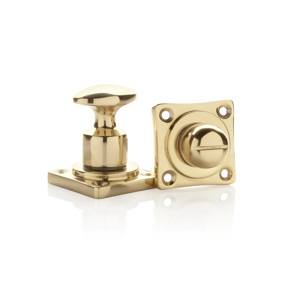 Deze klassieke vierkante toilet- en badkamersluiting is voorzien van een draaiknop met vrij/bezet plaat. De sluiting is afgewerkt met een gelakte messing coating, wat zorgt voor een warme en stijlvolle uitstraling.